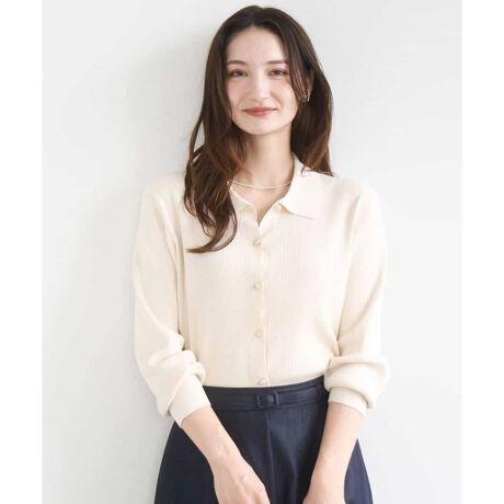 コンパクトな襟付きニット。前釦タイプですが、一枚着として前を閉じてプルオーバー感覚での着こなしがおすすめ。