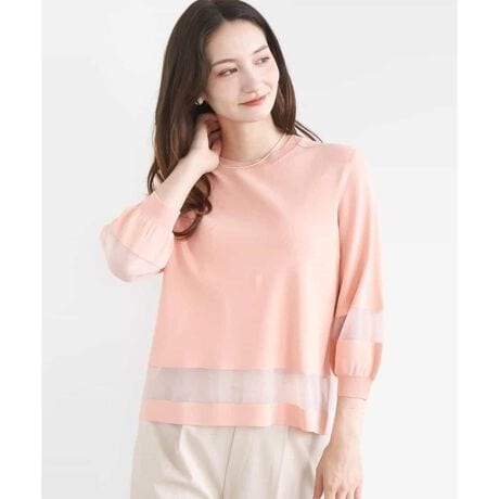 裾と袖口に同色のシアー素材で切替えを入れ軽さを出したニット。シンプルなのに洒落見えするデザインでコーディネートのポイントにも着映える一枚です。
