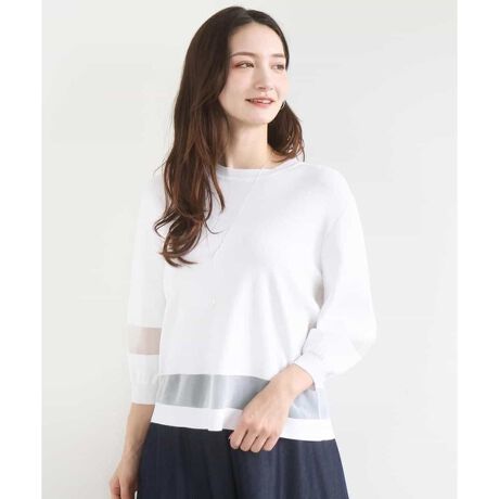 裾と袖口に同色のシアー素材で切替えを入れ軽さを出したニット。シンプルなのに洒落見えするデザインでコーディネートのポイントにも着映える一枚です。