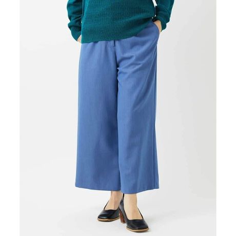 素材の滑らかなドレープ性を活かしイージーパンツのようなゆったりとリラクシーを感じるセミワイドパンツ。ゴム仕様のウエスト、フロントはギャザーなしのベルト仕立てですっきりと。トップスをウエストインにしてもキレイにすっきり見えするのが嬉しいポイント。幅広いアイテムに合わせやすくリラックス感ある穿き心地はデイリーに大活躍。