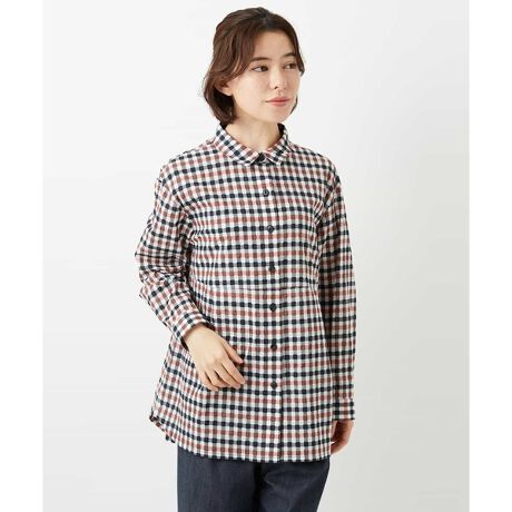 ゆったりとしたシルエットのチュニックタイプブラウスです。小さめの襟は柔らかな雰囲気を与え、ウエスト切り替えを利用したタックもリラックス感を持たせます。後ヨーク切り替えはバイヤスに縫製してチェック柄に動きを持たせています。