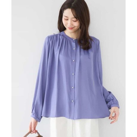 首周りがすっきりとしたバンドカラーデザインのブラウス。肩にギャザーを入れてゆとりのあるシルエットでリラックスした着心地に仕上げました。デザインポイントにきらりと光るメタル釦を使用。