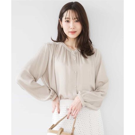 首周りがすっきりとしたバンドカラーデザインのブラウス。肩にギャザーを入れてゆとりのあるシルエットでリラックスした着心地に仕上げました。デザインポイントにきらりと光るメタル釦を使用。