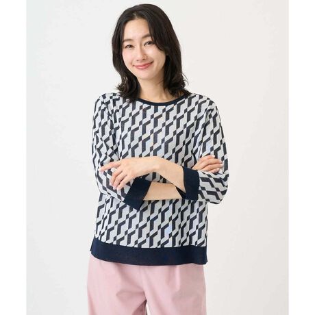 幾何柄を袋ジャカード編し、スッキリと見えるように裾と袖口は無地で締めて仕上げた着映えニットです。ジャージーのような薄く軽さのある編地が特徴で肌触りも良いニットです。薄手で8分袖のすっきり仕様なので、春から初夏も着回しが出来る一枚です。
