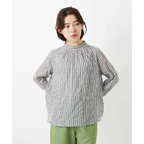 やわらかく、体のラインに自然になじむ素材で仕立てたスタンドカラーデザイン。かぶりタイプになっていて、後ろ開きにすることで、首元がすっきり見えるように仕上げました。襟元には縫いタックを入れ、ほどよいふくらみと立体感を持たせたデザインです。