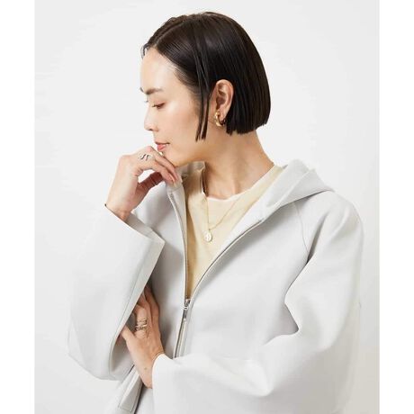 軽さが魅力のダンボール素材を使用した、春のお出かけに気軽に羽織れて頼りになるフードアウター。マットでドライタッチな表面感が、カジュアルなアイテムながらラフになりすぎない印象に仕上げています。コンパクトな丈感に、タックで広がりを持たせたバックスタイルがデザインポイント。腰まわりをさりげなくカバーできるのも嬉しいポイントです。