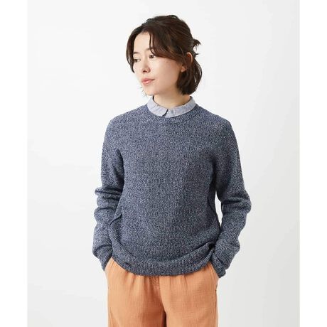 コットン100%の糸を使った、肌ざわりのよいニットです。前身頃は模様のある編み柄で表情を持たせ、袖と後身頃は天竺編みにすることで軽く着やすいデザインに。脇と袖下にもデザイン仕立ての縫製で切り替えることでさりげないアクセントを施し、脇のすそには編み紐をアクセントであしらうことで、抜け感のあるやわらかな印象に仕上げました。コットン100%の糸を使った、肌ざわりのよいニットです。