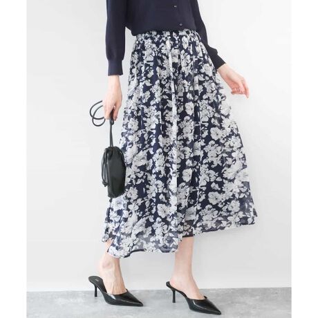 ふわっと軽やかなシルエットはトップスを選びません。大人っぽく着こなせる花柄は上品で落ち着いた雰囲気に。同素材のブラウスとセットアップでワンピース見えの着こなしも楽しめます。