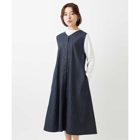フロントボタン明きのジャンパースカート。ボタン付きVネック面とクルーネック面と前後どちらを前にしてもスタイリングを楽しめるアイテムです。ボタンを1・2ヶ所止めたスタイリングやフルオープンにして着流しスタイルなどロングジレとしも活用できます。また、シャツやブルゾンなど羽織を合わせるなど色々なコーディネートを楽しめます。