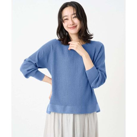 ややシャリ感のあるドライタッチな素材感で適度なハリもあり、ボディラインにまとわりつかず着心地抜群の一枚です。脇線を前に振ることで着痩せ効果を発揮し、前後差をつけてヒップをカバーしてくれる女性に嬉しいデザインのニットです。ほどよくゆったり感のあるサイズで、パンツにもスカートにも合わせやすいアイテムです。