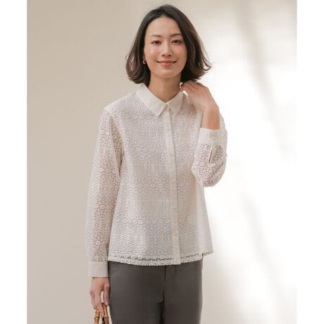 繊細なレースを贅沢に使用した、シャツカラーのブラウス。襟、前立て、カフス部分を別布で切り替え、甘さを抑え大人っぽい雰囲気に仕上げました。レース特有の繊細な透け感が、デニムからきれいめパンツまで、着こなしを女性らしく格上げします。前身頃が2重になっているので、1枚で着ても安心感のある着心地。いつのも着こなしにプラスするだけで、春の装いをぐっと華やかにしてくれるアイテムです。カラーは、清潔感のあるやさしい雰囲気のオフホワイト(#001)、ほんのり涼し気で爽やかな印象のサックス(#073)、華やかさと落ち着き感がバランスの良いネイビー(#075)の3色展開です。