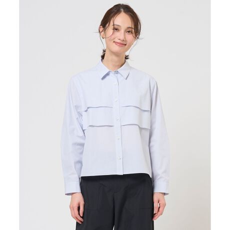■デザインフロント切り替えデザインがポイントの、ショート丈のシャツブラウス。程よいゆとりのあるボクシーシルエットに、前身頃の2段切り替えとストレートな裾ラインで、1枚で決まるトレンド感のあるシルエットに仕上げました。特にボリュームのあるボトムスとの相性がよく、カジュアルにもきれいめにも、幅広い着こなしを楽しめます。台襟とカフスには、マスキュリンな印象のシルバー釦をアクセントとして使用。細部のデザインが、着こなしをさりげなく格上げしてくれるアイテムです。カラーは、女性らしさを引き立てるピンク(#012)、爽やかで清涼感のあるサックス(#073)、落ち着きのあるニュアンスカラーのライトグレーストライプ(#103)、ナチュラルで温かみのあるベージュストライプ(#133)、クラシカルできちんと感のあるブルーストライプ(#170)の5色展開です。