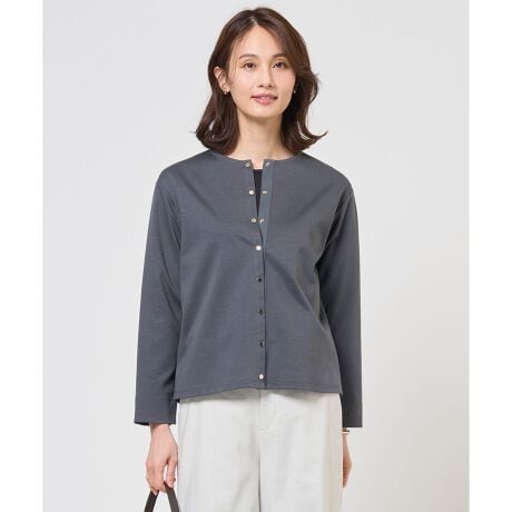 華奢なゴールドのドット釦がポイントのカーディガン。 前立ての裏側にグログランテープをあしらい、前を開けて着た際にさりげなく覗くこだわりのディテールがポイントです。カジュアルになりすぎない洗練されたデザインで、シンプルながら女性らしい印象の1着です。軽やかな着心地で、季節の変わり目の羽織りとしてはもちろん、オフィスでの冷房対策や旅行先での1枚としても重宝します。カラーは、落ち着きのあるニュアンスカラーのグレー(#004)、やわらかい色味で顔周りが明るくなるベージュ(#033)、シーンレスで使えるネイビー(#075)の3色展開です。