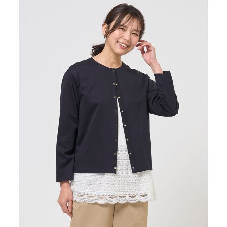 華奢なゴールドのドット釦がポイントのカーディガン。 前立ての裏側にグログランテープをあしらい、前を開けて着た際にさりげなく覗くこだわりのディテールがポイントです。カジュアルになりすぎない洗練されたデザインで、シンプルながら女性らしい印象の1着です。軽やかな着心地で、季節の変わり目の羽織りとしてはもちろん、オフィスでの冷房対策や旅行先での1枚としても重宝します。カラーは、落ち着きのあるニュアンスカラーのグレー(#004)、やわらかい色味で顔周りが明るくなるベージュ(#033)、シーンレスで使えるネイビー(#075)の3色展開です。