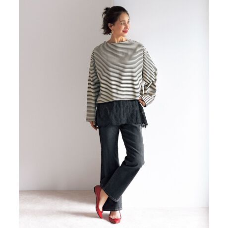 ■デザイン脚のラインを美しく見せるフレアデニム。膝より高い位置から自然に広がるフレアが、足を長く見せて着れます。UNFILO DENIMならではの柔らかく伸縮性のある素材感で、美しいシルエットを保ちながら着心地も抜群。控えめなユーズド加工を施した、落ち着いたブルーとグレーの展開。カジュアルにも上品にも合わせやすく、毎日履きたくなる一本です。