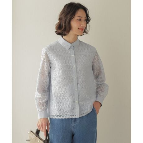 繊細なレースを贅沢に使用した、シャツカラーのブラウス。襟、前立て、カフス部分を別布で切り替え、甘さを抑え大人っぽい雰囲気に仕上げました。レース特有の繊細な透け感が、デニムからきれいめパンツまで、着こなしを女性らしく格上げします。前身頃が2重になっているので、1枚で着ても安心感のある着心地。いつのも着こなしにプラスするだけで、春の装いをぐっと華やかにしてくれるアイテムです。カラーは、清潔感のあるやさしい雰囲気のオフホワイト(#001)、ほんのり涼し気で爽やかな印象のサックス(#073)、華やかさと落ち着き感がバランスの良いネイビー(#075)の3色展開です。