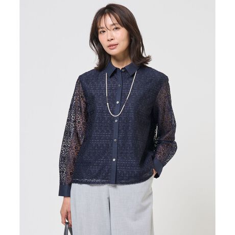 繊細なレースを贅沢に使用した、シャツカラーのブラウス。襟、前立て、カフス部分を別布で切り替え、甘さを抑え大人っぽい雰囲気に仕上げました。レース特有の繊細な透け感が、デニムからきれいめパンツまで、着こなしを女性らしく格上げします。前身頃が2重になっているので、1枚で着ても安心感のある着心地。いつのも着こなしにプラスするだけで、春の装いをぐっと華やかにしてくれるアイテムです。カラーは、清潔感のあるやさしい雰囲気のオフホワイト(#001)、ほんのり涼し気で爽やかな印象のサックス(#073)、華やかさと落ち着き感がバランスの良いネイビー(#075)の3色展開です。