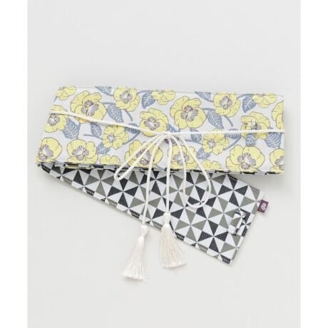 [型番:7JNP6109-2026]春の花々を描いた昭和モダンなデザインの帯ベルト。表は華やかな花柄、裏は上品な小紋柄で、リバーシブル仕様が魅力です。タッセル付きの紐がアクセントとなり、巻くだけで装いに和の趣をプラス。ワンピースやチュニックなど洋装にも合わせやすく、手軽に和モダンコーデが楽しめる一品です。