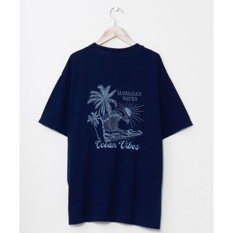 [型番:46R-6109-2026]デニム風の洗い加工が施されたメンズTシャツ。背中にはヤシの木と波を描いた刺しゅうが施され、胸ポケットにはワッペンがアクセントに。カジュアルながらもハワイの海を感じさせるデザインで、デニムやショートパンツとの相性も抜群。ほどよい厚みの生地で一枚でも快適に着こなせるアイテムです。製品洗いのため色合いに個体差があります。