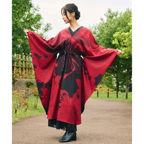 [型番:76L-6105-2026]和モードな雰囲気溢れるワンピース。牡丹の花と墨流し柄を織り交ぜたデザインで、振袖をイメージしたシルエットが印象的です。贅沢に生地を使ったドレープが美しく、身頃のホールに通すウエスト紐で着方のアレンジも可能。お手入れが簡単なポリエステル素材で、帯ベルトなどを合わせてもお楽しみいただけます。