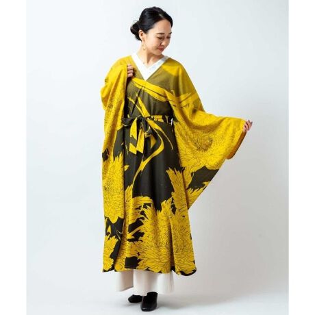 [型番:76L-6105-2026]和モードな雰囲気溢れるワンピース。牡丹の花と墨流し柄を織り交ぜたデザインで、振袖をイメージしたシルエットが印象的です。贅沢に生地を使ったドレープが美しく、身頃のホールに通すウエスト紐で着方のアレンジも可能。お手入れが簡単なポリエステル素材で、帯ベルトなどを合わせてもお楽しみいただけます。