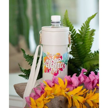 [型番:46HP6101-2026]ペットボトルを入れるだけで保冷・保温ができるボトルホルダー。ストラップ付きで肩からかけられる便利なデザインです。ナチュラルな素材感とハワイらしいカラーで、外出やピクニックにもぴったりです。食洗機× 保冷効力4.6℃以下1時間 保温効力48℃以上1時間