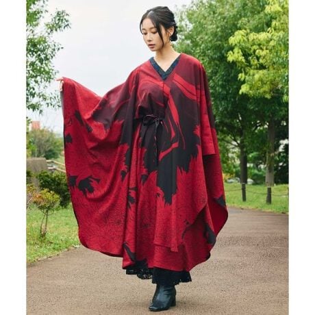 [型番:76L-6104-2026]和モードを雰囲気溢れる羽織。牡丹の花と墨流し柄を大胆に配したデザインで、振袖を思わせるシルエットが特徴です。袖下が開いており、動くたびに裏面の無地の色が見える仕様。贅沢に生地を使用したドレープが美しく、ポリエステル素材で扱いやすい商品です。
