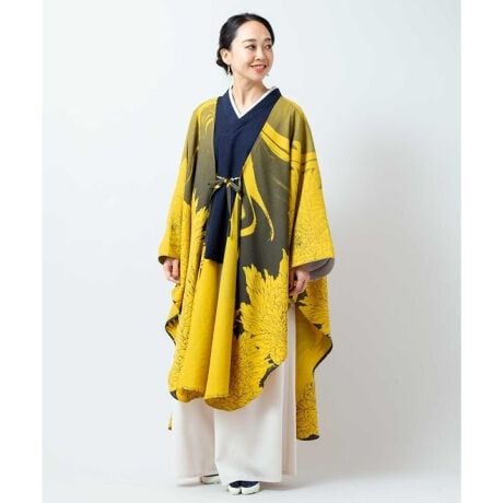 [型番:76L-6104-2026]和モードを雰囲気溢れる羽織。牡丹の花と墨流し柄を大胆に配したデザインで、振袖を思わせるシルエットが特徴です。袖下が開いており、動くたびに裏面の無地の色が見える仕様。贅沢に生地を使用したドレープが美しく、ポリエステル素材で扱いやすい商品です。