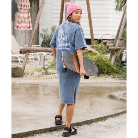 [型番:46R-6108-2026]デニム風の洗い加工が施されたワンピース。背中に施されたヤシの木と波の刺しゅうが印象的で、胸元のワッペンがさりげないアクセントに。リラックス感のあるシルエットで着心地も良く、一枚でハワイの海風を感じるようなカジュアルスタイルを楽しめます。デイリーにもリゾートにもぴったりなアイテムです。製品洗いのため色合いに個体差があります。