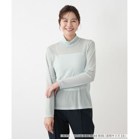 繊細な透け感が、装いに上品な奥行きを添えるパワーネット仕立ての長袖カットソー。夏の強い日差しや室内の冷房対策としても一枚あると大変重宝いたします。さらりとした肌触りと軽やかな着心地が魅力で、伸縮性に優れた素材が身体の動きにやさしく寄り添い、ストレスフリーな着用感をお届けします。首元を美しく見せるハイネックデザインが、カジュアルな中にもきちんと感を演出。ジャケットやジレのインナーとしてはもちろん、ジャンパースカートやワンピースとのレイヤードスタイルにも最適です。シンプルな無地デザインですので、合わせるアイテムを選ばず、着こなしの幅をぐっと広げてくれることでしょう。ご自宅でお手入れしやすい手軽さも、日常使いに嬉しいポイントです。