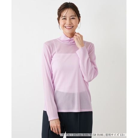 繊細な透け感が、装いに上品な奥行きを添えるパワーネット仕立ての長袖カットソー。夏の強い日差しや室内の冷房対策としても一枚あると大変重宝いたします。さらりとした肌触りと軽やかな着心地が魅力で、伸縮性に優れた素材が身体の動きにやさしく寄り添い、ストレスフリーな着用感をお届けします。首元を美しく見せるハイネックデザインが、カジュアルな中にもきちんと感を演出。ジャケットやジレのインナーとしてはもちろん、ジャンパースカートやワンピースとのレイヤードスタイルにも最適です。シンプルな無地デザインですので、合わせるアイテムを選ばず、着こなしの幅をぐっと広げてくれることでしょう。ご自宅でお手入れしやすい手軽さも、日常使いに嬉しいポイントです。