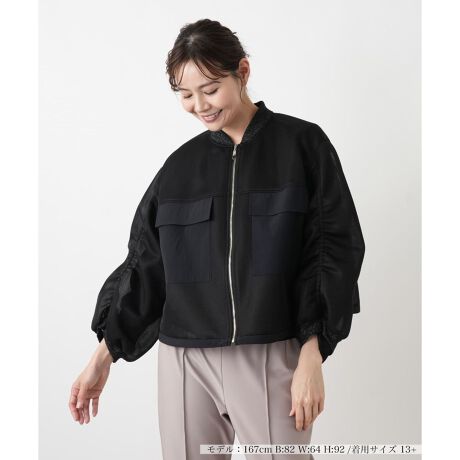 空気を纏うような軽やかな質感が、洗練された雰囲気を演出します。たっぷりと生地を使ったボリュームのある袖は、腕を動かすたびに優雅なふくらみを描きます。胸元のフラップポケットがデザインにメリハリを与え、首元と袖口のリブがシルエットを心地よく引き締めます。フロントのジッパーが縦のラインを強調し、全体をすっきりとした印象にまとめます。