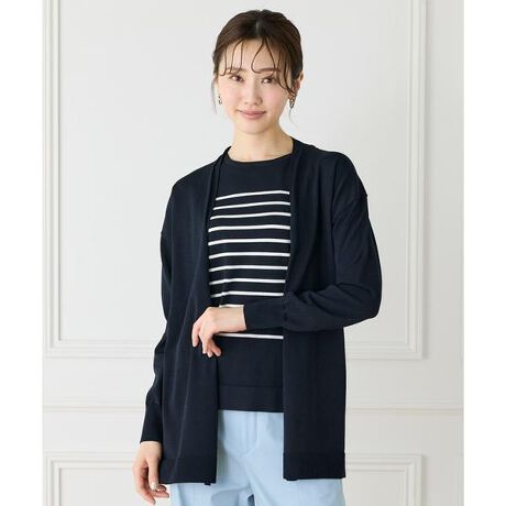 ■デザインロングカーディガンとフレンチスリーブニットのアンサンブルです。着流しカーディガンはヒップが隠れる安心丈で、体形をカバーしながら上品な雰囲気を感じさせます。また、夏場の羽織りとしても活用していただけます。フレンチスリーブのインナーはほどよく肩周りをカバーし、ゆったりしたシルエットなので一枚でも着こなしを楽しんでいただけます。今シーズンはインナーを全色ボーダー柄にし、より単品使いしやすくアップデートしました。■素材テンセル特有の光沢感となめらかさにポリエステルの張り感が合わさった風合いが特徴の素材。独特の光沢感と柔らかさに加え清涼感のある編地に仕上がっています。インナーは全面に冷感ナイロン糸を編み込み、接触冷感機能で夏まで長くお召しいただけます。・水洗い可