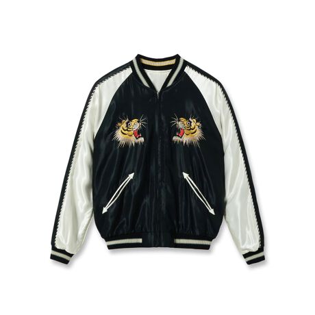 表面はブラック×オフホワイトのモノトーン調のボディに、月夜に咆哮する虎を配した「THE スカジャン」といえる王道の絵柄。1950年代中期の作品をもとに刺繍の針足を駆使して虎の毛並みや筋骨隆々とした体躯を写実的に表現しており、黒いサテン生地に際立つコントラストの強い配色で、迫り来るような迫力を持った躍動感あふれる仕上がりとなっている。背中のJAPANの文字はヴィンテージでも人気の高いオリエンタルなフォントを再現。