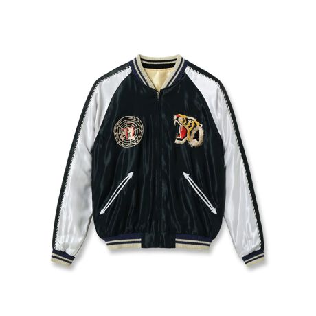 スーベニアジャケットのなかで最もスタンダードな両面にアセテート生地を使ったリバーシブルタイプ。戦後当時のスカジャンには、シルクに似た高級感を持つ物資統制外品目のアセテートが使われていた。中綿がないため季節を問わず着用でき、独特なドレープ感も魅力といえる。