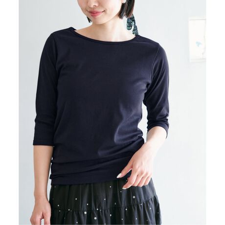 別注で作成したボートネックTシャツは、開きすぎないネックと、手元がすっきりとした七分袖とのバランスにこだわり、ボリュームのあるパンツやスカートにもバランスよく合わせられる仕上がり。