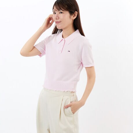 シンプルなソリッドのショートスリーブコットンポロセーター。胸元のフラッグロゴが、さりげなくクオリティの高さを物語ります。クロップド丈により、トレンド感が漂うスタイリングが完成。袖口と裾の細かいフリルが、フェミニンな要素をプラスしてくれます。