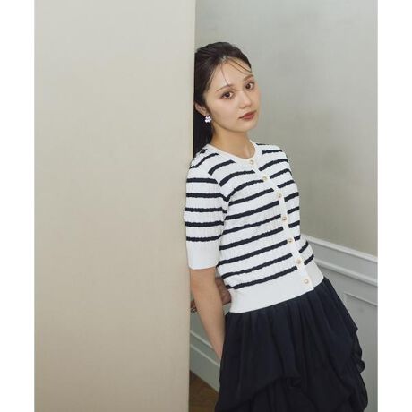 それぞれ仕様が異なる3色を揃えたケーブルカーディガン。すべてのカラーに金色ボタンを使用。大きすぎないサイズ感で上品なシルエットは、スカートやパンツと相性が良い着丈です。マルチボーダーと無地ネイビーのみ、胸元に山内ともなさんコラボ特別刺しゅう「YT」入りです。「モノトーンボーダー」刺しゅうなし。シンプルなボーダーとケーブル編みに金色ボタンが映える品の良いデザイン。「マルチボーダー」刺しゅうあり。追求された馴染みの良いマルチボーダーカラーとケーブル編みの組み合わせ。フレアデニムパンツ合わせでカジュアルにも着回せる万能さが魅力。「ネイビー」刺しゅうあり。ボーダーが苦手な方も取り入れやすい無地ネイビーとケーブル編みが大人な雰囲気です。