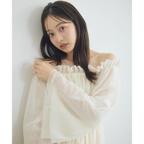 襟元にギャザーを入れた華やかなデザインのチュールブラウス。ギャザーのボリュームで、視線を上に集めて小顔効果を期待できます。顔まわりをすっきり見せながら、フェミニンな印象もプラス。パンツとのコーディネートがおすすめです。