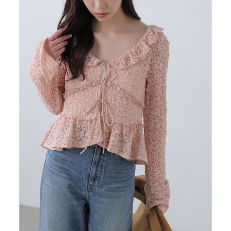 立体感のあるぷくぷくレースを使用した前開きブラウス。肉感のあるレースなのでカジュアルにも着こなせます。襟にフリル、バスト切り替えにギャザーフリルをあしらい、高めのウエスト位置とイレヘムの裾フリルでバランス良く仕上げたデザイン。袖は肘を細く、袖口に向かって広がるスリット入りフレアスリーブです。リボンと釦で開閉でき、一枚着はもちろん羽織りとしても長く活躍。日よけや冷房対策にもおすすめです。※モデルの着用画像の場合、光の当たり具合により、実際の色味と異なって見えることがございます。色味は、商品単体の画像をご参照ください。