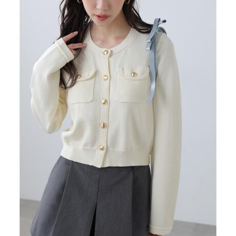 人気アイテムを春素材にアップデート!金色ボタン付きフラップポケットが可愛いニットカーディガン。金色ボタンが映えるプレッピーなデザインはそのまま、今回は、からっとしたコットンライクな風合いにし、さらりと着用いただけます。ワイドボトムはもちろん、ショートパンツやミニスカート合わせもおすすめです。※モデルの着用画像の場合、光の当たり具合により、実際の色味と異なって見えることがございます。色味は、商品単体の画像をご参照ください。