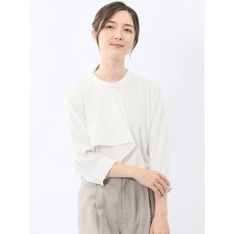 お顔まわりを華やかに演出してくれる、7分袖のプルオーバーブラウスです。ドレープ感のあるラッフルフリル、すっきりとしたバンドカラー、袖口にあしらったカフス、背中の涙開き、手首をすっきり見せる7分袖がポイント。キチンと感のあるクリーンなルックスなのでオンオフ兼用で大活躍してくれます。