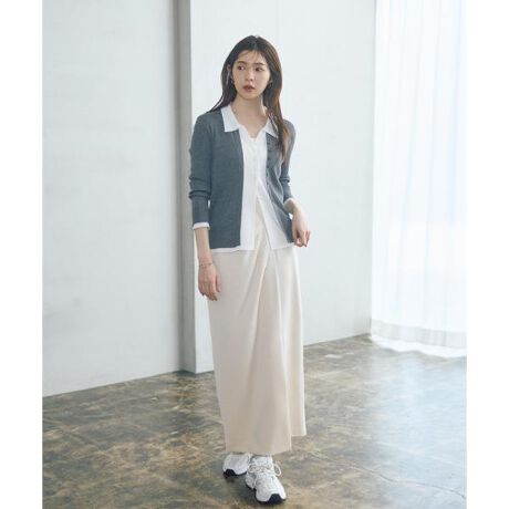 タック&スリットでキレイなシルエットを叶えるナロースカート。フロントタックがウエストまわりをすっきり見せながら、腰やお腹まわりをカバーします。左寄りに入れた深めのフロントスリットが女性らしく、スタイルアップ効果を期待。ハリ感と落ち感のある素材で、体の線を拾いすぎず、縦ラインを上品に見せてくれます。キレイめが好きだけど体型はさりげなくカバーしたい方におすすめの一枚です。