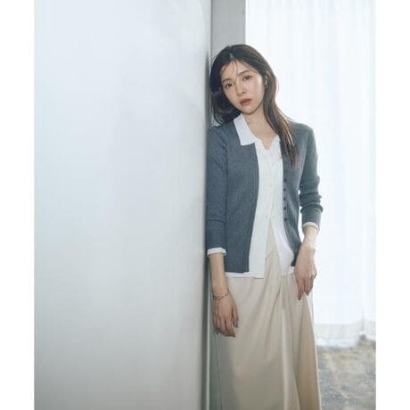 配色デザインが目を引く、一枚でサマになるレイヤード風リブニット。襟と前立ての配色が顔まわりを明るく、上品な印象に見せてくれます。細めのリブが縦ラインを強調し、スタイルアップ効果を期待。前開きボタンのため、トップス風にも、ボタンを開けて抜け感のある着こなしも楽しめます。甘さを抑えたコンパクトな襟で、キレイめにもカジュアルにも着回せるデザイン。体のラインを拾いすぎない程よいフィット感で、女性らしさと上品さを両立した一枚です。