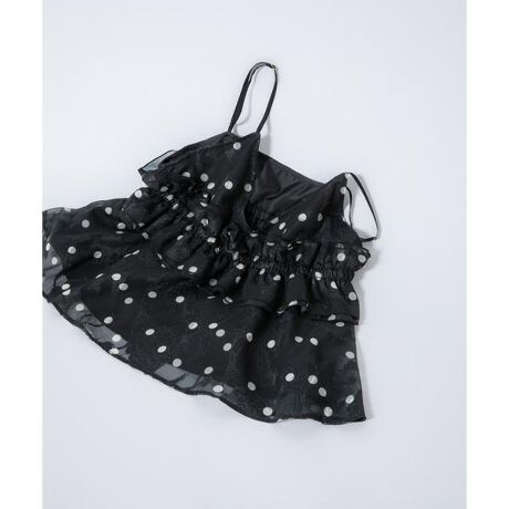 カットジャガード素材にドットプリントを施した、ほどよくカジュアルな印象のキャミビスチェ。透け感のある軽やかな素材感で、胸元のギャザーフリルがポイントです。後ろは長さ調整可能なアジャスターが付いています。<素材>毛足のある素材にインクジェットプリントを施しており、プリントされていない部分がランダムに出る特徴があります。<詳細>仕様・開閉なし裏地・あり透け感・ややあり / 光沢・なし / 伸縮性・なし生地の厚さ・薄手※モデルの着用画像の場合、光の当たり具合により、実際の色味と異なって見えることがございます。色味は、商品単体の画像をご参照ください。