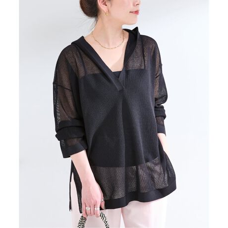 フリガラで、ハリ感と清涼感あるとても軽い生地感が特徴です。フード付きで程よくゆったりしたサイズ感のデザインになっており、合わせるインナーは、ロンTEEからタンクやキャミまで色々なレイヤードを楽しめる一枚となっています。