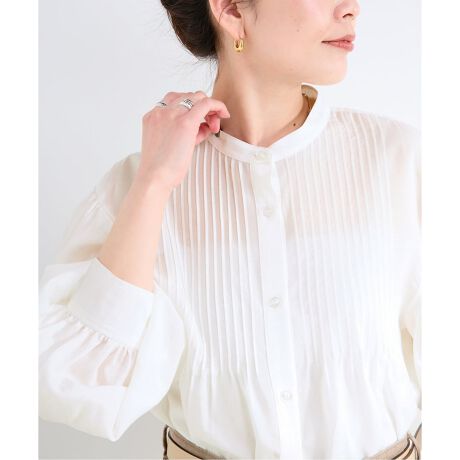 肩の位置に細かなピンタックを施した、上品なバンドカラーブラウス。