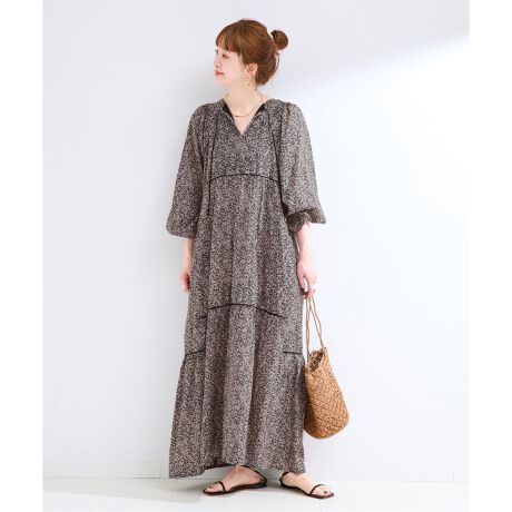 繊細なフラワーやリーフをモチーフにしたモノトーンプリントが美しいワンピース。オリジナルより丈感を出したB.C STOCK別注アイテムです。