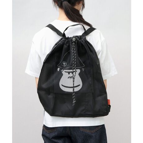 シンプルなのになぜか使いやすくて手に馴染む、『まもるさんのナップサック』。メッシュ生地から覗く、ゴリラのまもるさんフェイスが目を惹くアイテム。サイドの“GORELAX”ピスタグがアクセントに。