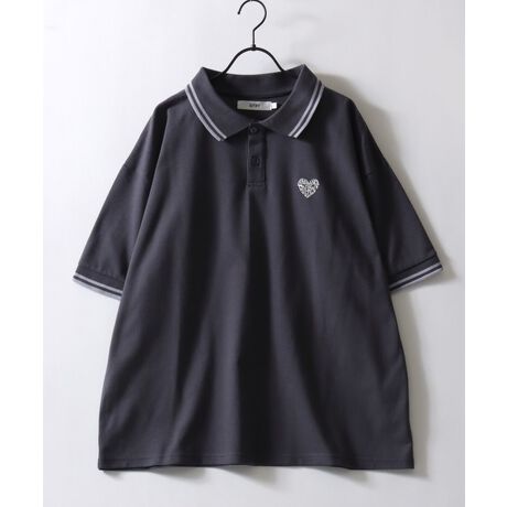 【SITRY Heart Embroidery Polo Shirt/別注 オーバーサイズ ハートロゴ ワンポイントラメ刺繍 リブライン 半袖ポロシャツ レディース メンズ】